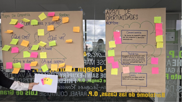 Posteriormente, cada grupo socializó su solución con los demás para así obtener una retroalimentación y poder realizarle mejoras o modificaciones, este es un proceso llamado polinización de ideas. Por otra parte, después de concretar sus ideas, se empleó la herramienta de prototipado en 3D llamada 4prot para generar la visualización de los espacios, usuarios y contextos que aplicaban a la solución dada por cada equipo.