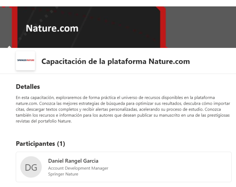 En esta capacitación, exploraremos de forma práctica el universo de recursos disponibles en la plataforma nature.com. Conozca las mejores estrategias de búsqueda para optimizar sus resultados, descubra cómo importar citas, descargar textos completos y recibir alertas personalizadas, acelerando su proceso de estudio. Conozca también los recursos e información para los autores que desean publicar su manuscrito en una de las prestigiosas revistas del portafolio Nature.