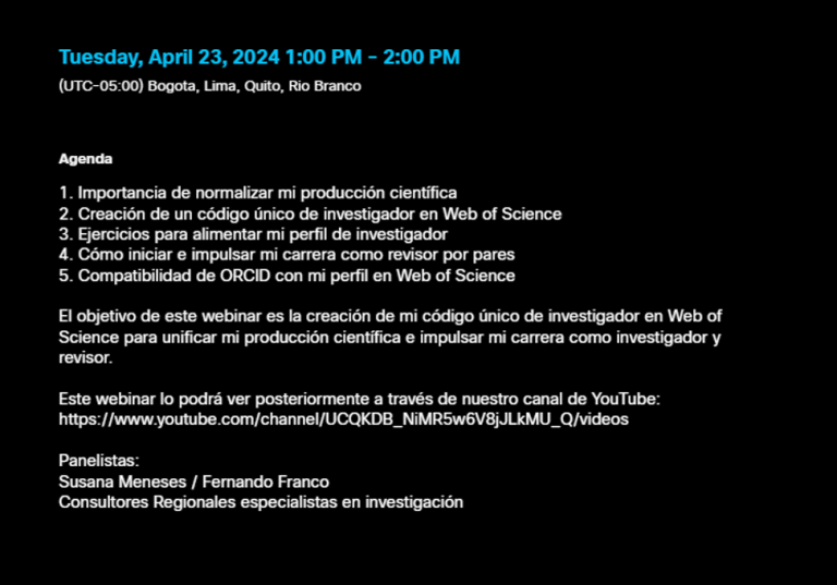 El objetivo de este webinar es la creación de mi código único de investigador en Web of Science para unificar mi producción científica e impulsar mi carrera como investigador y revisor.
