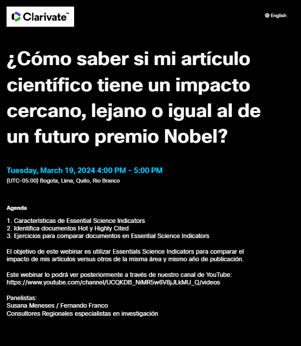 El objetivo de este webinar es utilizar el Essentials Science Indicators para comparar el impacto de mis artículos versus otros de la misma área y mismo año de publicación.