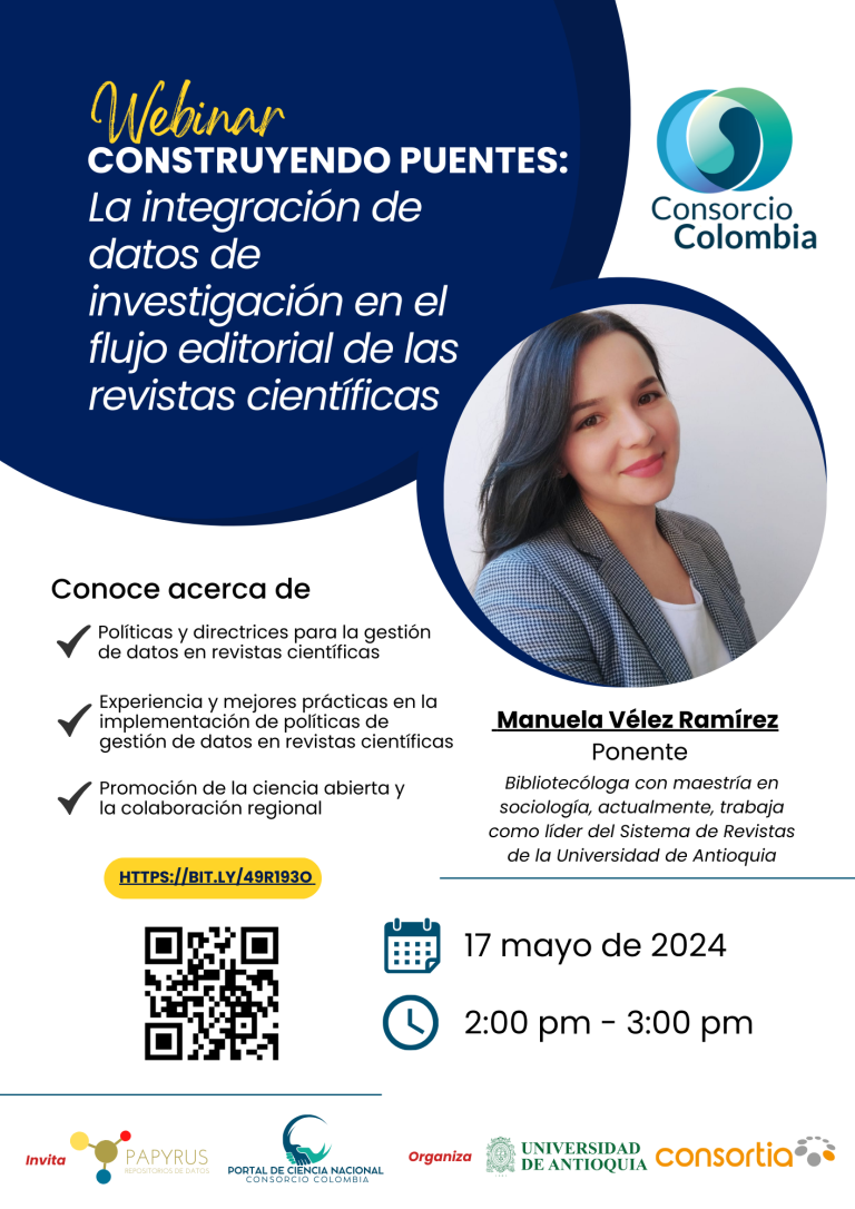 Objetivo del evento: dar un recuento de las estrategias y políticas que pueden utilizar las revistas latinoamericanas para incorporar la gestión de datos de investigación dentro de sus procesos editoriales, así como las estrategias para optimizar estas novedosas prácticas en marco de la ciencia abierta